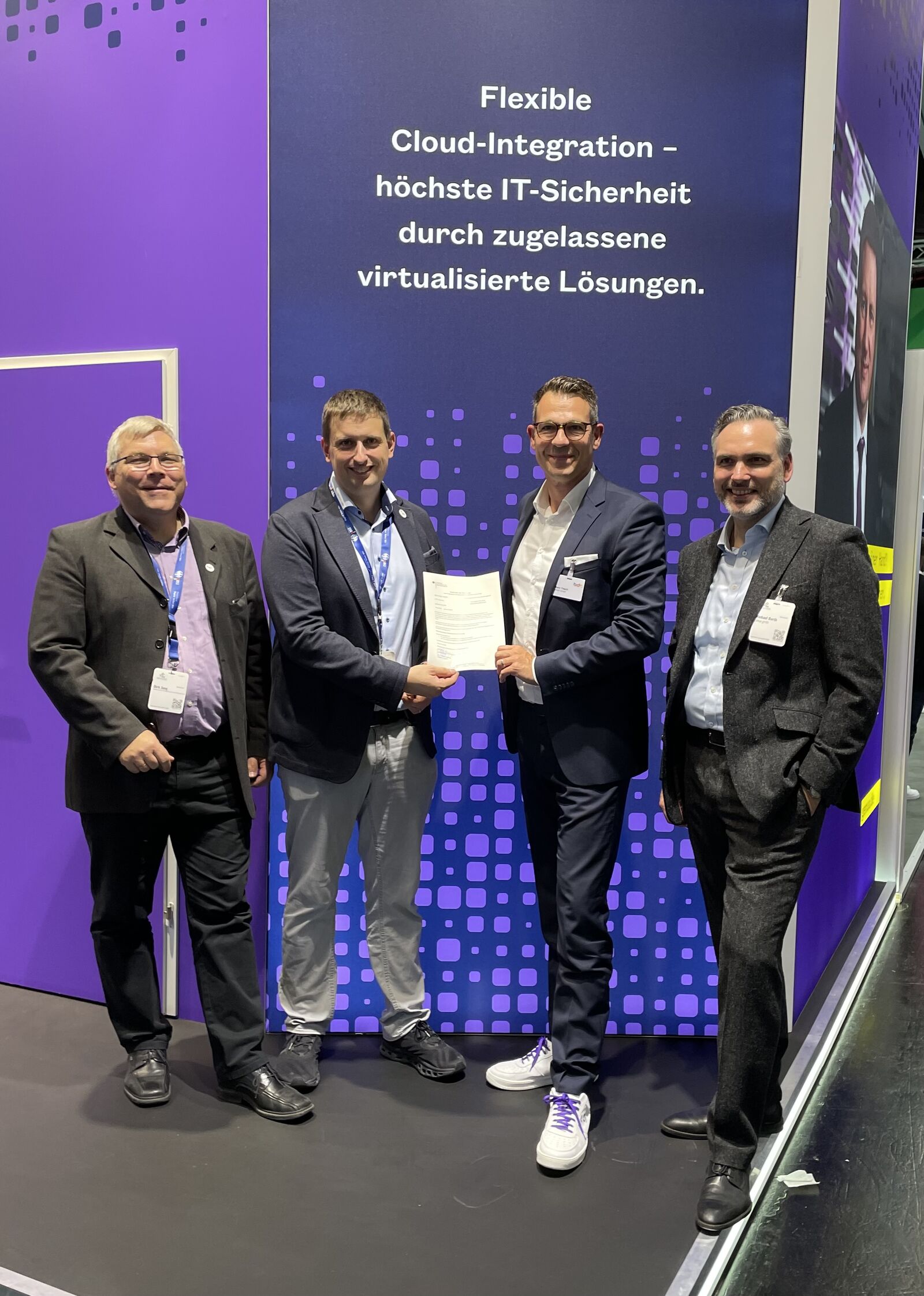 • “Secure, scalable IT infrastructures for modern everyday working life”: Dirk Jung, Head of Division at the BSI, and Dr. Christopher Basting, Head of Department at the BSI, present the certificate of approval for genuscreen Virtual to Marc Tesch, Managing Director of genua, and Michael Barth, Head of Strategy at genua (from left to right).  © genua GmbH